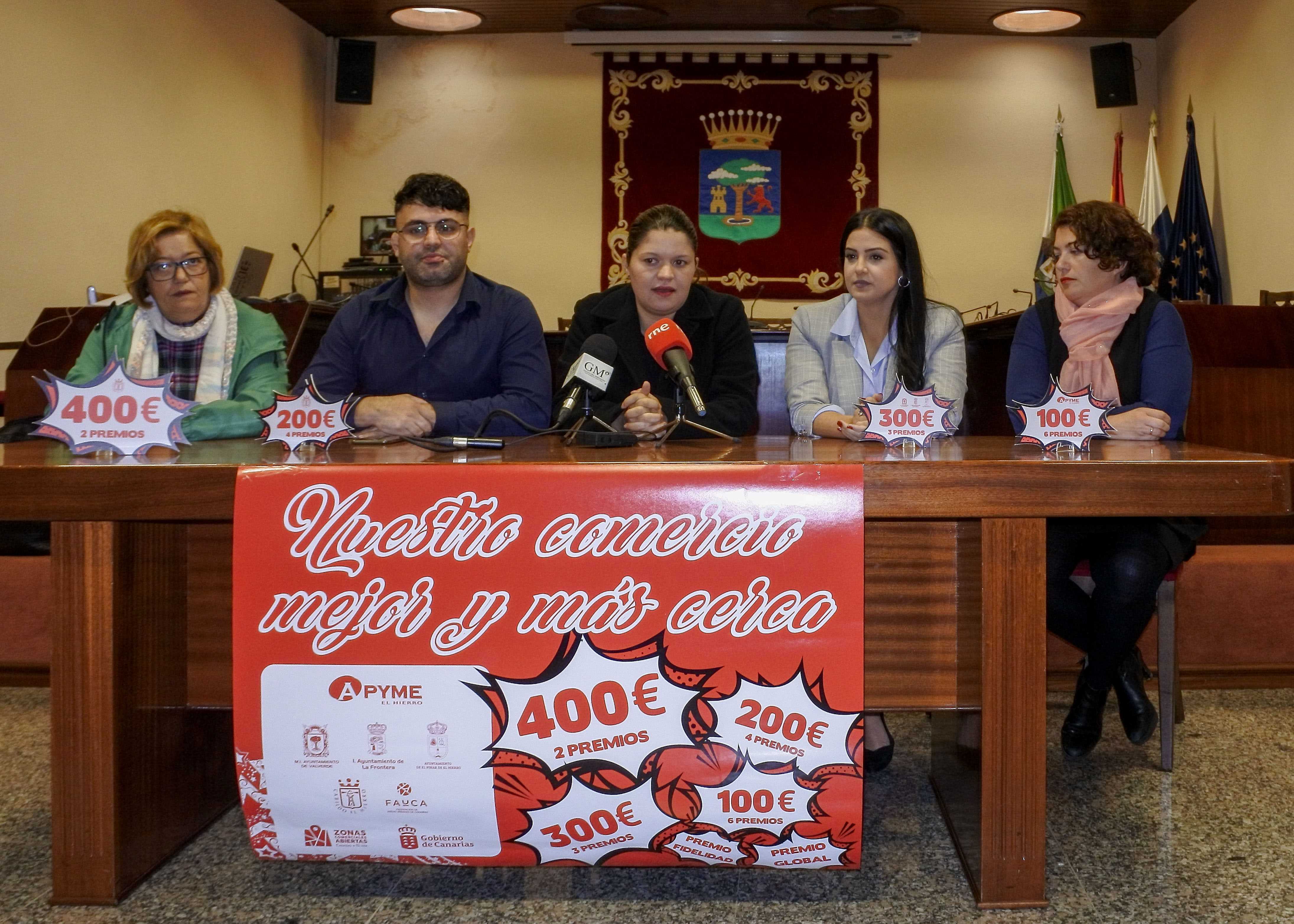 La Asociación de Pequeñas y Medianas Empresas de El Hierro (APYME El Hierro) presentó viernes, 23 de noviembre, su campaña comercial de cara a estas Navidades 2018 “Nuestro Comercio Mejor y Más Cerca”. Una campaña que cuenta con la colaboración del Cabildo de El Hierro y los tres ayuntamientos de la isla. El presidente de APYME El Hierro, Feliciano López; la consejera insular de Economía, Milagros del Valle Padrón y las concejales de Comercio del Ayuntamiento de Valverde, Tatiana Brito; de La Frontera, Susana Pérez, y de El Pinar, Magaly González fueron los encargados de ofrecer los pormenores de esta ya clásica campaña navideña que promueve el consumo local y que, en esta ocasión se adelanta en fechas -se pone en marcha el 3 de diciembre próximo- y aumenta las cuantías económicas de sus premios. Un total de 15 premios, entre los 100 a 400 euros para el que resulte afortunado en el sorteo que se llevará a cabo el próximo 14 de enero y que, este año, también tendrá premio especial de cada comercio a la fidelidad de su cliente más habitual, según explicó López, quien agradeció la implicación de las administraciones locales en esta campaña. Por su parte, la consejera insular de Economía, Milagros del Valle Padrón, agradeció el esfuerzo de Apyme y el apoyo del tejido empresarial herreño y animó al consumo local, en el comercio cercano, por todo lo que representa para la propia sociedad herreña y su desarrollo. De igual manera, tanto Tatiana Brito, Susana Pérez como Magaly González pusieron de manifiesto la importancia de esta acción promocional comercial para cada uno de sus términos municipales y alentaron a consumir estas Navidades en la propia isla, recordando las dificultades del emprendedor y la pequeña y mediana empresa en una isla no capitalina, como es El Hierro, y lo que representan para la economía insular. La campaña también cuenta con la colaboración de Cruz Roja El Hierro, que llevará a cabo una recogida solidaria de juguetes en los comercios adheridos a la misma.