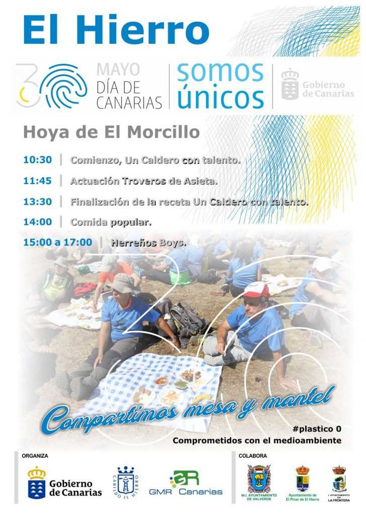 Bajo el lema “Somos únicos”, “compartimos mesa y mantel”,  El Hierro conmemora el Día de Canarias, el próximo 30 de mayo, con un gran encuentro en la Hoya de El Morcillo en el que los herreños podrán disfrutar de la jornada festiva uniendo cultura y gastronomía. El acto está organizado por el Gobierno de Canarias, Cabildo de El Hierro y GMR Canarias con la colaboración de los ayuntamientos de Valverde, El Pinar y La Frontera. La presidenta del Cabildo de El Hierro, Belén Allende, apunta que la gastronomía se convertirá en un “caldero de talento” con el que mostrar la riqueza culinaria y cultural de la isla. Así, de manos del chef Juan Carlos Clemente, 6 cocineros herreños dirigirán los fogones ese día: 3 de ellos, ya consagrados en la cocina y en representación de cada uno de los tres ayuntamientos de la isla, y otros 3 elegidos por despuntar con éxito en el sector de restauración insular. Además, explica Allende, estos 6 cocineros tendrán la ayuda de 18 personas relevantes de la vida cultural y social de El Hierro a modo de “pinches de cocina” que irán introduciendo en ese “caldero con talento” los ingredientes necesarios para culminar con éxito esa comida que se compartirá entre todos. Desde las 10:00 horas comenzará la elaboración del cocinado de la receta que se ofrecerá a todas las personas que decidan celebrar el día de Canarias compartiendo mesa y mantel en El Morcillo. Además de la oferta gastronómica, la jornada se vestirá de fiesta con actuaciones musicales como la de los Troveros de Asieta, prevista para las 11:45 horas en este paraje natural del monte de pinar herreño. Troveros de Asieta presenta una formación de 9 músicos y cuenta con ocho trabajos discográficos publicados hasta la fecha, “Tradicional” (1994), “Vamos a hacerlo bueno” (1997), “Siempre sonriendo” (2001) , “Bailando con Lecuona” (2004), “Aquí en la Isla” (2008) ,“Troveros de Asieta 20 Años-2 CDs” (2011), “El son tiene duende “ (2014) y “Querida Cuba” (2017). El buen hacer de Troveros de Asieta ha sido reconocido por la crítica especializada, incluyéndolo entre las formaciones más importantes de la música cubana hecha en Europa, lo que ha sido ratificado por los expertos cubanos que le han concedido el Premio Internacional Cubadisco 2012. En este concierto el Grupo presentará los temas de su último trabajo discográfico lanzado al mercado en diciembre del pasado año “Querida Cuba”, si bien también aprovechará la ocasión para ofrecer al público del Hierro varios títulos de sus trabajos anteriores. La jornada del 30 de Mayo finalizará en El Morcillo con la actuación de los “Herreños Boys” de 15 a 17:00 horas. La celebración de este Día de Canarias comenzó hoy jueves, 24 de mayo, con la actuación de mil estudiantes de La Palma, Lanzarote, El Hierro, Fuerteventura, La Gomera, Gran Canaria y Tenerife en el Encuentro Musical de Coros Escolares, dentro de las actividades programadas por el Gobierno autonómico para conmemorar el Día de Canarias. La iniciativa ha llevado al escenario a estudiantes de Primaria y Secundaria, a alumnos de los Conservatorios y de las escuelas municipales e insulares de música, para interpretar, de forma simultánea en las siete islas, el Himno de Canarias. El Himno sonará al unísono, a las 12:30 horas, en el Centro Cultural Sábanos, en El Hierro, en el Teatro de Tías, en Lanzarote, en el Auditorio Infanta Cristina, en La Gomera, en el Auditorio Antonio Lecuona, del Conservatorio Superior de Música de Canarias, en Tenerife, el Auditorio de El Paso, en La Palma, Auditorio Insular de Puerto del Rosario, en Fuerteventura, y en el Conservatorio Profesional de Música de Las Palmas de Gran Canaria, en Gran Canaria.